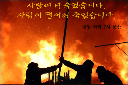 이 모든 일은 생존권에 대한 보장을 해달라며 농성에 들어간 철거민들에게 불과 25시간 만에 경찰특공대를 투입하여 피할 곳도 없는 옥상에서 토끼몰이 하듯이 진압해버린 대한민국 정부와 경찰이 저지른 만행이다. 이것이 진정 현실인가. 이들이 정녕 우리의 정부란 말인가.