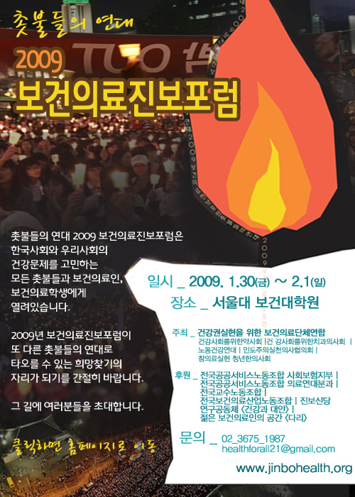 촛불들의 연대 : 2009보건의료진보포럼은 한국사회와 우리사회의 건강문제를 고민하는 모든 촛불들과 보건의료인, 보건의료학생에게 열려있습니다. 2009년 보건의료진보포럼이 또 다른 촛불들의 연대로 타오를 수 있는 희망찾기의 자리가 되기를 간절히 바랍니다. 그 길에 여러분들을 초대합니다.