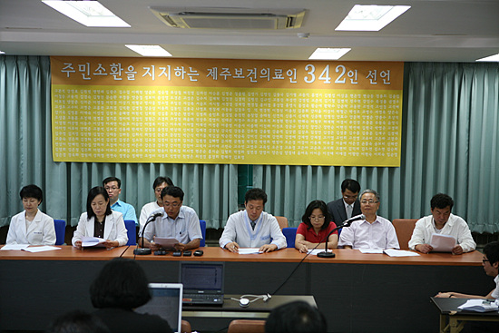 지금 주민소환투표제도가 시행된 이후 처음으로 제주도에서 광역자치단체 후보 소환이 진행중이다. 바로 김태환 제주도지사가 소환대상이다. 김태환씨는 제주도민의 민의에 반하여 독선적인 도정운영으로 제주도민의 평화와 환경, 복지를 파탄내고 있다. 우리 보건의료인들은 제주도민들의 김태환 도지사 소환에 뜻을 같이하며 다음과 같이 우리의 의견을 밝힌다.