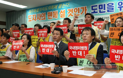 넷째 이번 제주도내 영리병원 허용은 민주주의 원칙에 정면으로 역행하는 것이다. 작년 7월 김태환 도지사는 자신있게 영리병원 허용여부를 제주도민의 여론조사로 결정하겠다고 여론조사를 실시하였다. 그러나 이 여론조사 결과는 제주도가 실시한 조사임에도 불구하고 반대(39.9%)가 찬성(38.2%)보다 많아 정책추진이 중단되었던 것이다. 작년과 올해 달라진 점은 이 영리병원이 투자개방형 병원으로 바뀌었다는 것 외에 달라진 것이 없다. 최소한의 민주적 절차도 거치지 않은 채 제주도민의 민의에 정면으로 역행하는 이번 제주도 영리병원 허용의 추진은 민주주의 정면으로 어긋나는 것이다.