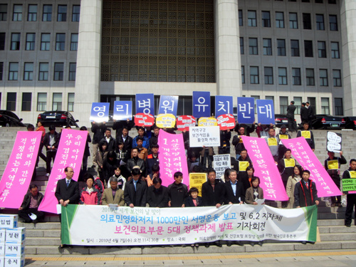 국민들은 현재 건강보험의 낮은 보장성과 비급여 부담 때문에 병원 치료비에 큰 불안을 가지고 있다. 또한 의료기관의 영리화와 경쟁 심화에 따라 급성기병상은 과잉공급되고 있고, 필수공익의료기관은 부족하며 국민의료비는 OECD 국가 중 가장 급속하게 증가하고 있다. 그런데 이명박정부의 정책방향은 의료공급체계의 공공성을 높이고, 건강보험 하나로 진료 받을 수 있도록 하는 것이 아니다. 오히려 경영적자를 핑계로 공공병원 중 하나인 적십자병원은 폐업을 유도하고 있고, 영리병원을 도입하려 하고 있다. 기존의 의료법인 병원마저 영리화를 촉진하고, 민간의료보험을 활성화하는 의료민영화정책을 지속적으로 추진해왔다. 이러한 정부의 정책기조는 올해도 지속되고 있다.