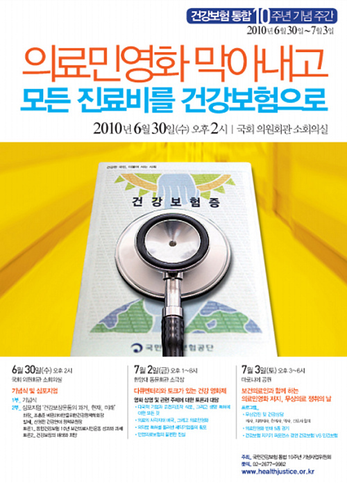 2010년 7월 1일은 건강보험통합 10주년이 되는 날이다. 이에 국민건강권의 향상을 위해 부단한 노력을 기울여 왔던 진보적 시민, 노동단체와 회원들은 국민들과 함께 이를 자축하고 건강권은 국민뿐 만 아니라 외국인 거주자 모두의 권리이며 다른 인권의 발전을 위해서 핵심적이고 필수적인 권리라는 점을 확인한다. 국가는 이를 보장하고 증진시킬 의무가 있으며, 보건의료인과 의료단체는 그 상업적인 이익과는 상관없이 건강에 대한 윤리와 책임이 있다는 점을 인식하고, 건강권 확보는 의료, 노동, 인권, 복지 등 모든 영역의 시민사회의 적극적인 참여로 실현될 수 있다는 역사적인 실천 경험을 인식하면서, 다음과 같이 국가의 의무와 시민사회의 책무에 관한 선언을 발표한다.