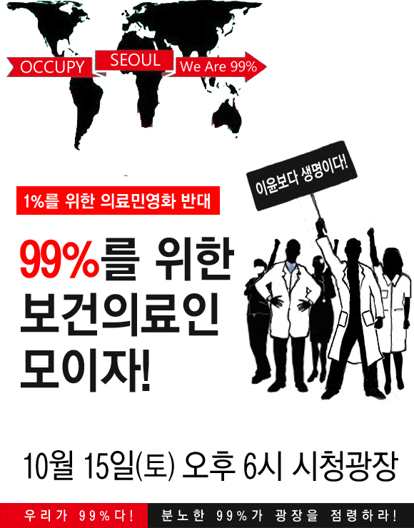 이에 전세계적 움직임에 동참함 동시에 한국의 절박한 국민들의 외침을 모아내기 위해 10월 11일 한국에서도 투기자본감시센터, 보건의료단체연합, 인도주의실천의사협의회, 한미FTA저지 범국본, 민주노총, 전농, 참여연대, 진보연대 등 30여개 시민사회단체들이 모여 [ 1%에 맞서는 99%, 분노하는 99% 광장을 점령하라. "Occupy 서울” 국제 공동 행동의 날 ] 준비 모임 구성했다. 그리고 10월 15일 저녁 6시, 서울광장에서 시민들의 자발적이고 창조적인 방식으로 행사를 진행하며 가능하면 서울 뿐 아니라 전국의 다른 도시에서도 진행할 수 있도록 할 계획이다.
