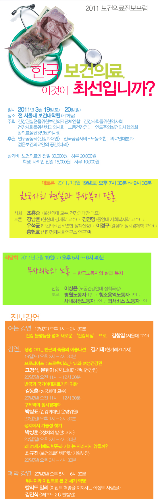 1. 건강권실현을 위한 보건의료단체연합(집행위원장 김정범 이하 보건의료단체연합)이 오는 19일부터 20일까지 양일간 혜화동 소재 전 서울대 보건대학원에서 2011 보건의료진보포럼을 개최, 건강과 무상의료 그리고 무상복지를 둘러싼 문제들을 집중 조명한다.