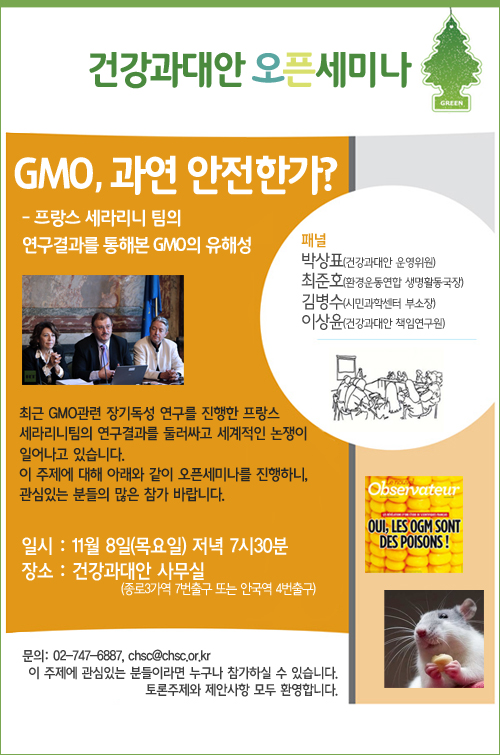최근 GMO관련 장기독성 연구를 진행한 프랑스 세라리니팀의 연구결과를 둘러싸고 세계적인 논쟁이 일어나고 있습니다. 이 주제에 대해 아래와 같이 오픈세미나를 진행하니, 관심있는 분들의 많은 참가 바랍니다.