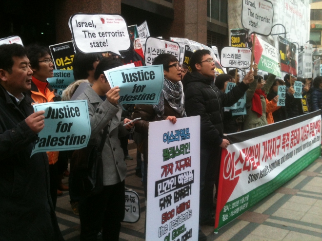 한국 평화활동가 100여명, 이스라엘 대사관 앞에서 규탄 기자회견 가져