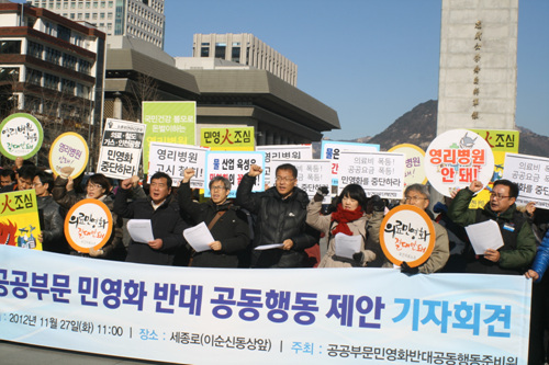 공공서비스는 국민의 것이다! 공공서비스는 재벌 등 사기업에 팔아치워 마땅한 상품이 아니다! 국민 세금으로 건설되고 운영되는 공공재이자, 국가 정책의 기본적 보루이다. 제 아무리 비즈니스 프렌들리 정권이라고 해도 국민의 권리를 팔아치울 권한은 없다. 공공부문 민영화는 즉각 철회되어야 한다. 공공부문 민영화에 반대하는 온 국민의 이름으로 민영화 중단과 공공서비스 강화를 다시 한번 분명히 밝히는 바이다.