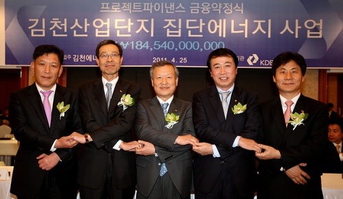 산업은행은 25일 출자자인 SK E&S, 코오롱건설 등과 김천산업단지 열병합발전소 프로젝트파이낸스(PF) 금융약정에 서명했다고 밝혔다. 금융기관 가운데는 현대해상화재보험 등 8개사가 참여했다. 왼쪽부터 안효상 김천에너지 대표이사, 문덕규 SK E&S 대표이사 , 공세일 산업은행 부행장, 안병덕 코오롱건설 대표이사, 배명호 김천에너지 대표이사. 2011.4.25 ⓒ연합뉴스