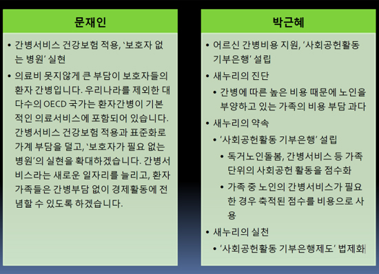 그런데 마침 16일 열린 3차 대선후보 TV 토론에서 관련된 내용이 언급되었다. 문 후보가 박 후보에게 전액 국가가 부담하는 4대 중중질환 진료비에 간병비도 포함된 것이냐고 물어본 것이다. 그러자 박 후보는 간병비도 포함된 것이라 대답했다. 4대 중증질환에 대해서는 비급여까지 포함해서 전액 국가가 부담할 예정이기에 간병비는 당연히 포함된다는 것이다. 이는 지난 토론회 때 본인이 한 발언과 정면으로 배치된다. 그럼 도대체 어느 말이 맞는 것일까?