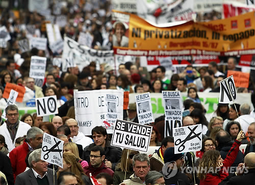 (마드리드 AP=연합뉴스) 스페인 주요 도시들에서 17일(현지시간) 의료계 종사자를 포함한 수천 명이 공공 의료 부문의 민영화 계획에 반대하는 시위를 벌였다.