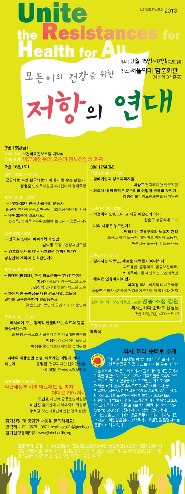 또 보건의료문제에 있어서도 그 동안 논쟁이 되어 온 뜨거운 주제들을 다루어 보려고 합니다. 정부의 간호조무사폐지와 관련한 토론이 열릴 것이고 보건의료계열 학생들의 최고로 높은 등록금의 현실조사와 발표도 잡혀있습니다. 의료계내의 고질적인 배타적 전문주의 문제, 의사성과급제에 대한 토론, 의료인들의 관점에 본 낙태를 둘러싼 논쟁 등이 주제로 잡혀있습니다.